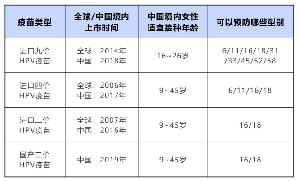 目前國內共有進口九價、進口四價、進口二價和國產二價HPV疫苗,“價數”是對可預防型別數量的簡稱,簡單來說,“價數”越高,可以預防的型別越多。詳細信息請看下表: