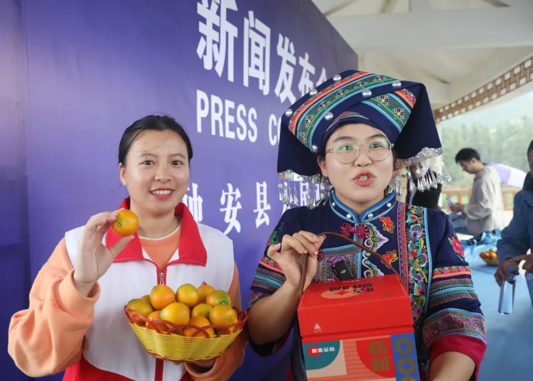 10月27日拍攝的2023年融安金桔上市時間新聞發布會現場。(韋榮軍?攝)一顆融安金桔為何受到消費者的青睞?融安金桔是一顆有歷史厚度的金桔。融安縣是“中國金桔之鄉”,“融安金桔”有近300年的種植歷史,其果實金黃、清香甜脆、入口化渣、甜蜜可口,被稱為專為電商而生的金桔良種。近年來,融安縣委、縣政府大力推進“半畝金桔助脫貧,一畝金桔奔小康,萬畝金桔促振興”的決策。如今,“融安金桔”種植覆蓋了全縣12個鄉鎮,作為全縣的支柱產業之一,其規模、產量、品種和品質在全國金桔主產區中位居前列,也是全國最大的滑皮和脆蜜金桔生產基地。2023年,“融安金桔”種植面積達22.1萬畝,預計總產量25萬噸,總產值33.9億元,參與發展人數超過10萬人,農民人均單項收入1萬元以上。