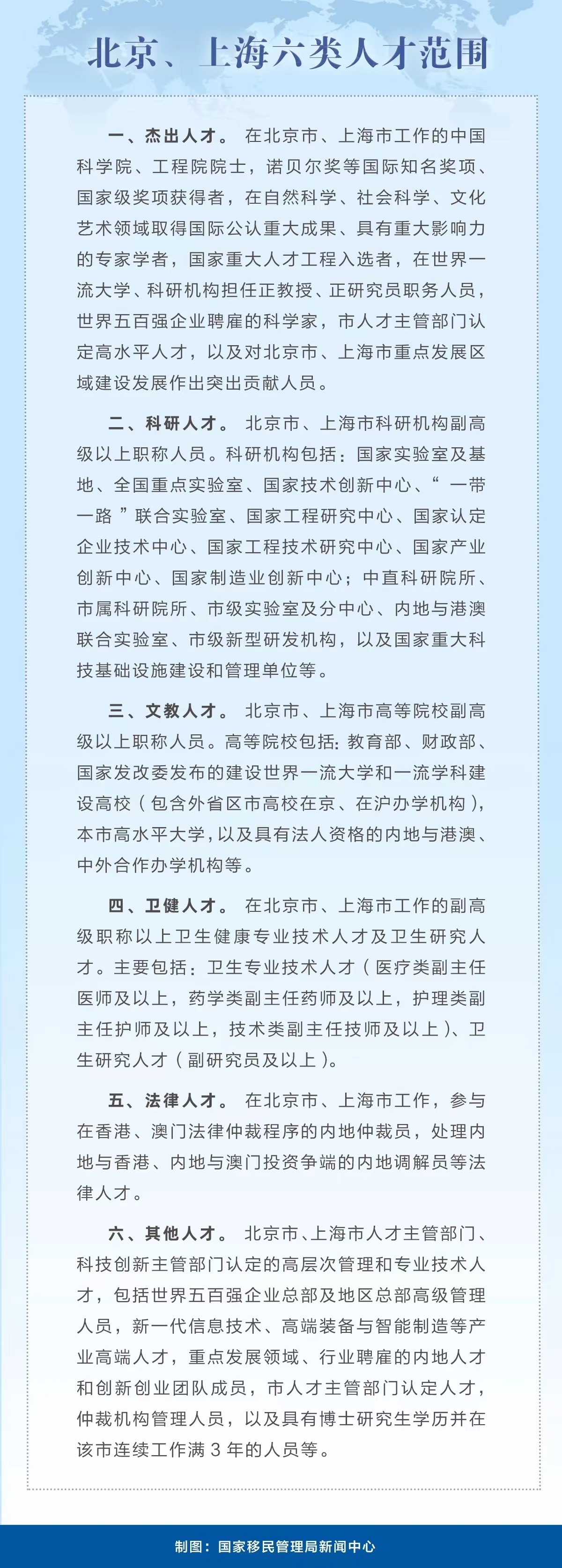三、北京、上海六類人才可以申辦赴港澳人才簽注。將赴港澳人才簽注政策由粵港澳大灣區內地城市擴大至北京、上海。在北京、上海工作的杰出人才、科研人才、文教人才、衛健人才、法律人才以及管理人才等六類人才,可以憑有關人才證明,單獨或者同時申請辦理有效期1至5年不等的多次赴香港和赴澳門人才簽注,每次在香港或者澳門停留不超過30天。
