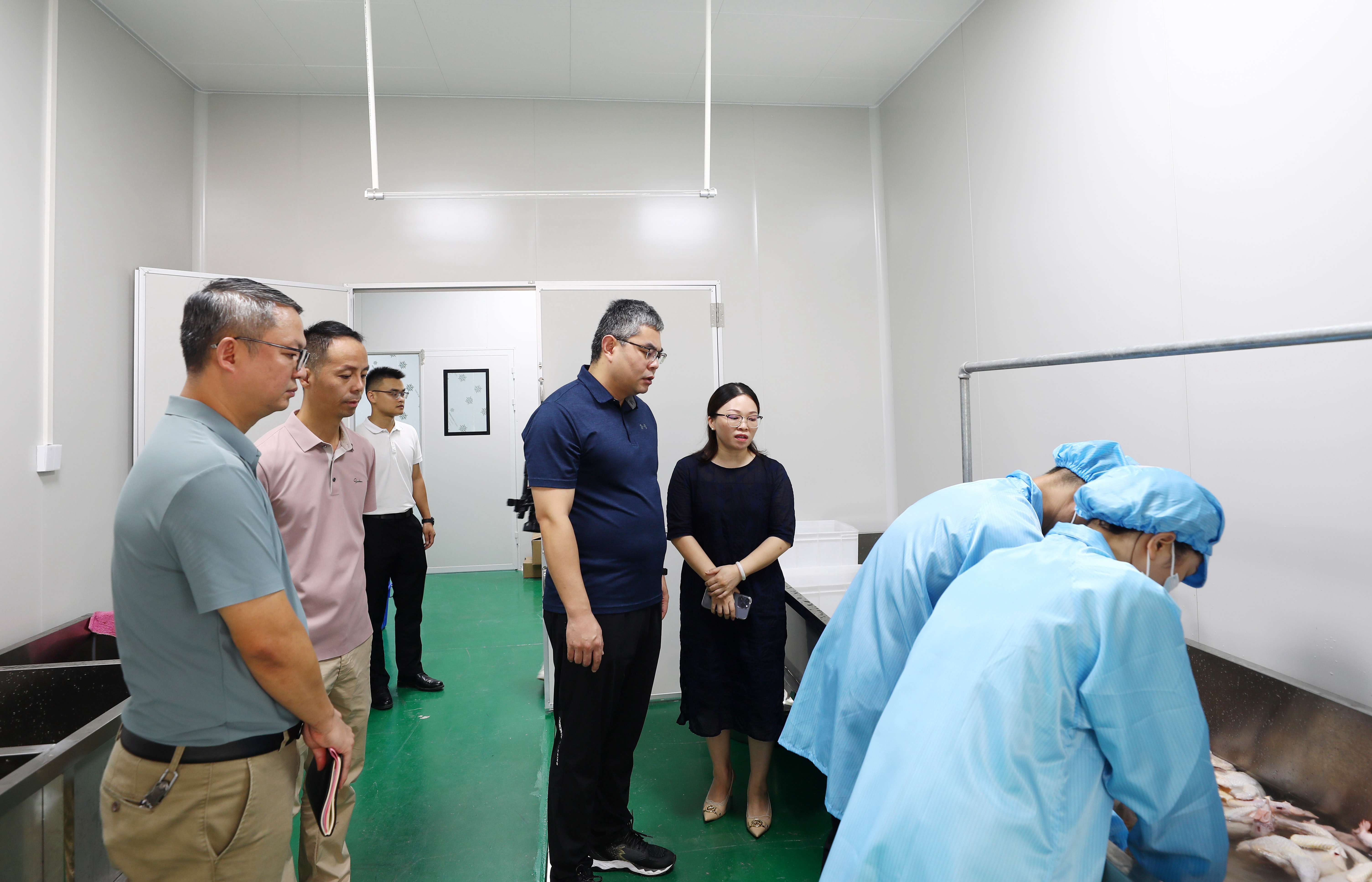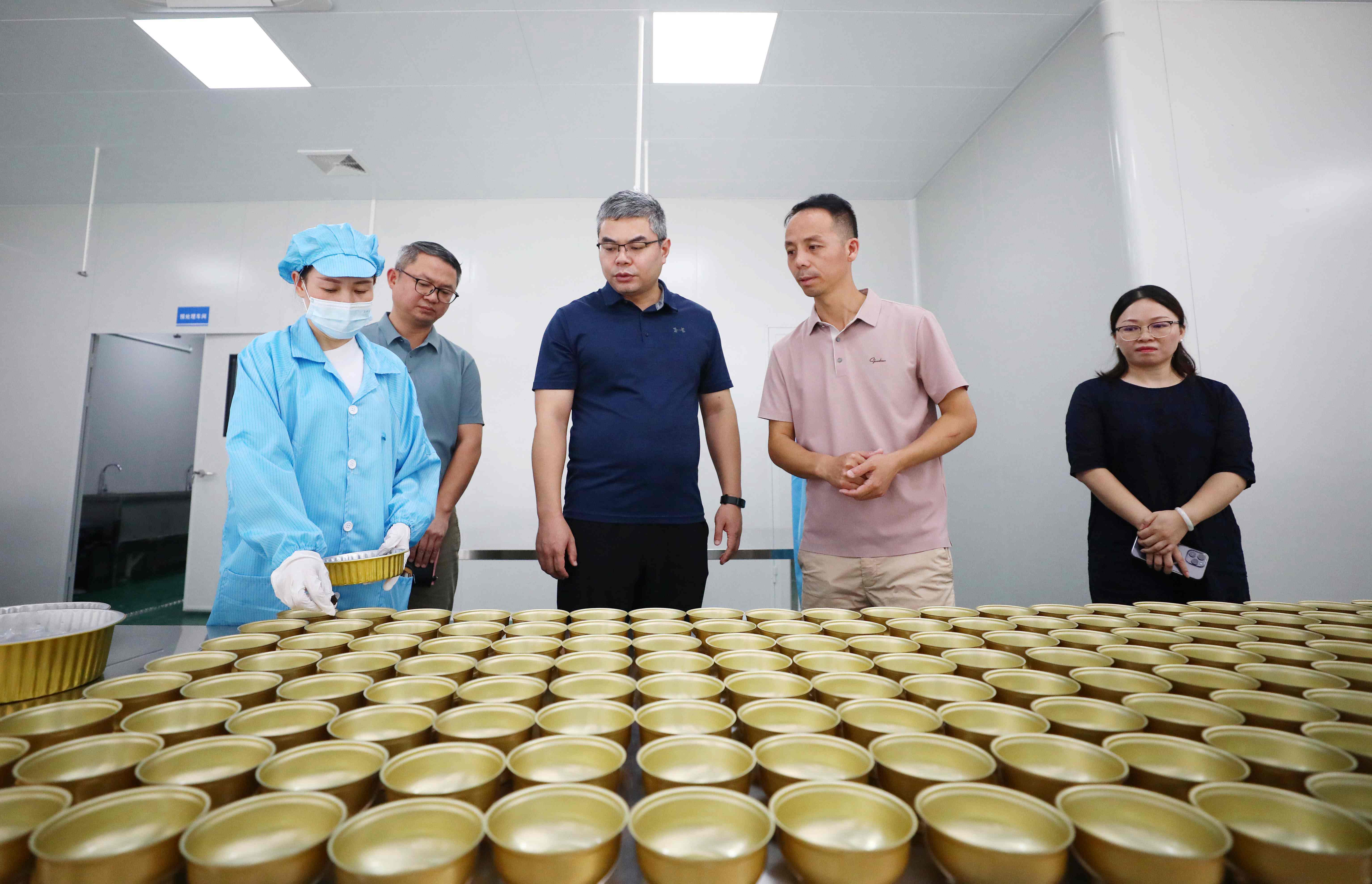 8月9日,在廣西榮粵農(nóng)業(yè)科技有限公司生產(chǎn)車(chē)間,縣委書(shū)記于福堅(jiān)(右四)在了解企業(yè)生產(chǎn)情況。(韋榮軍 攝)