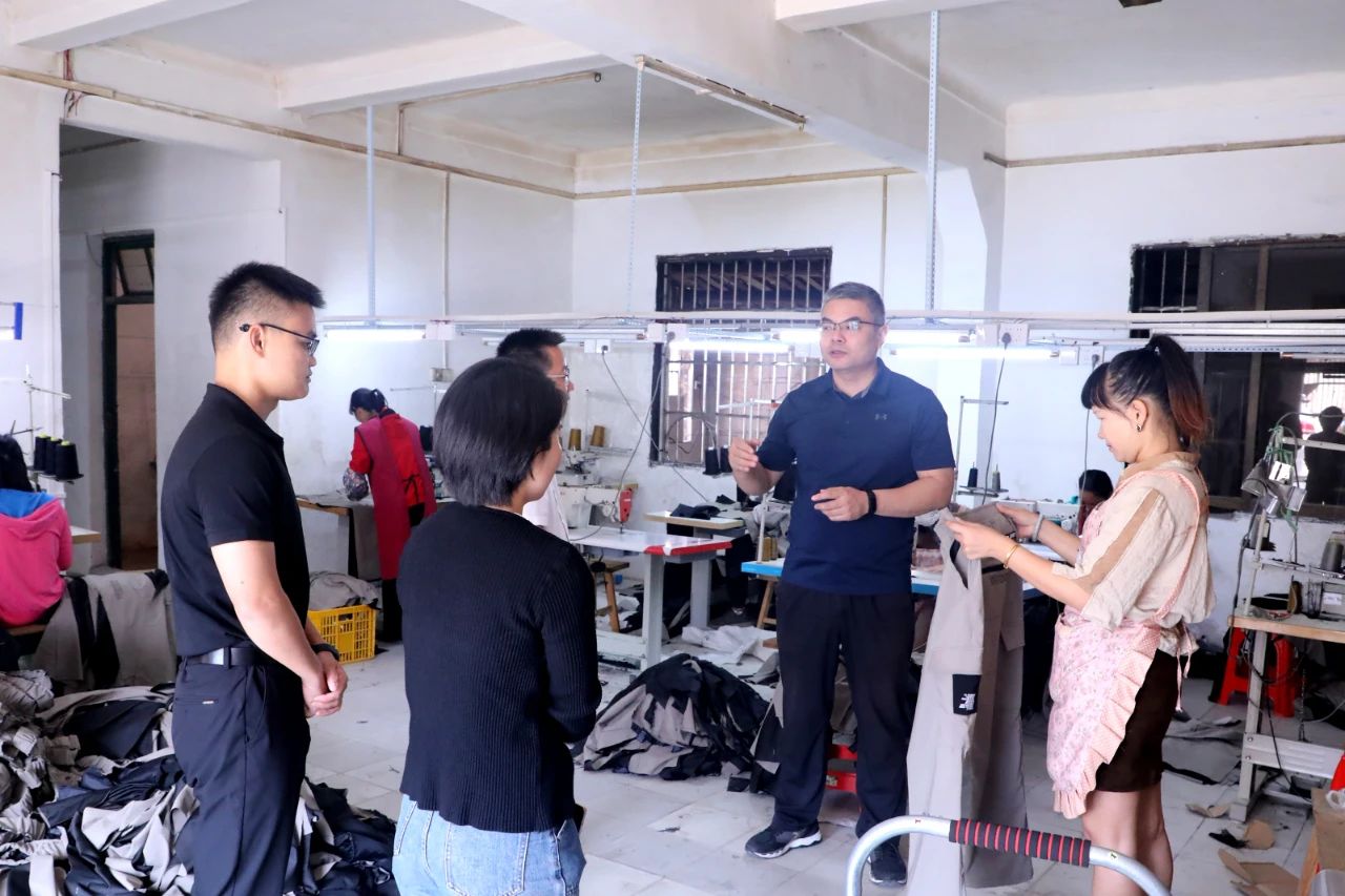11月6日,融安縣委書記于福堅(右二)到閩興牛仔休閑褲服裝浮石分廠調研。(衛綱 攝)