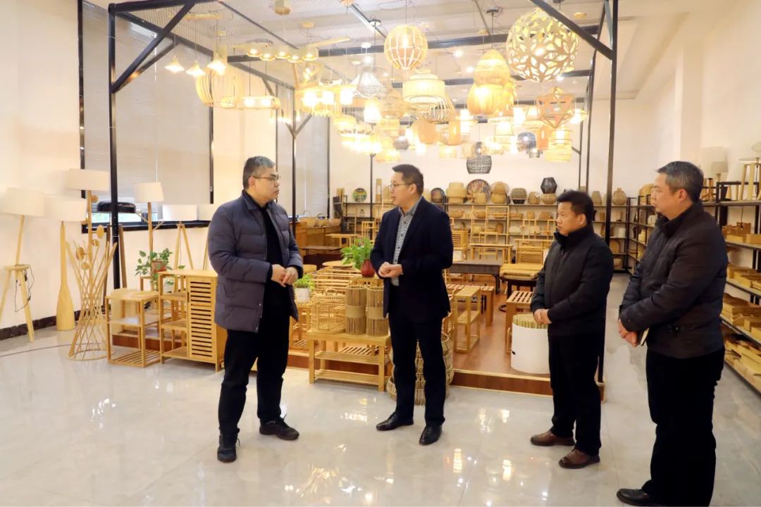 2月8日,融安縣委書記于福堅(左一)到融嘉工藝有限公司走訪調研。(衛綱 攝)