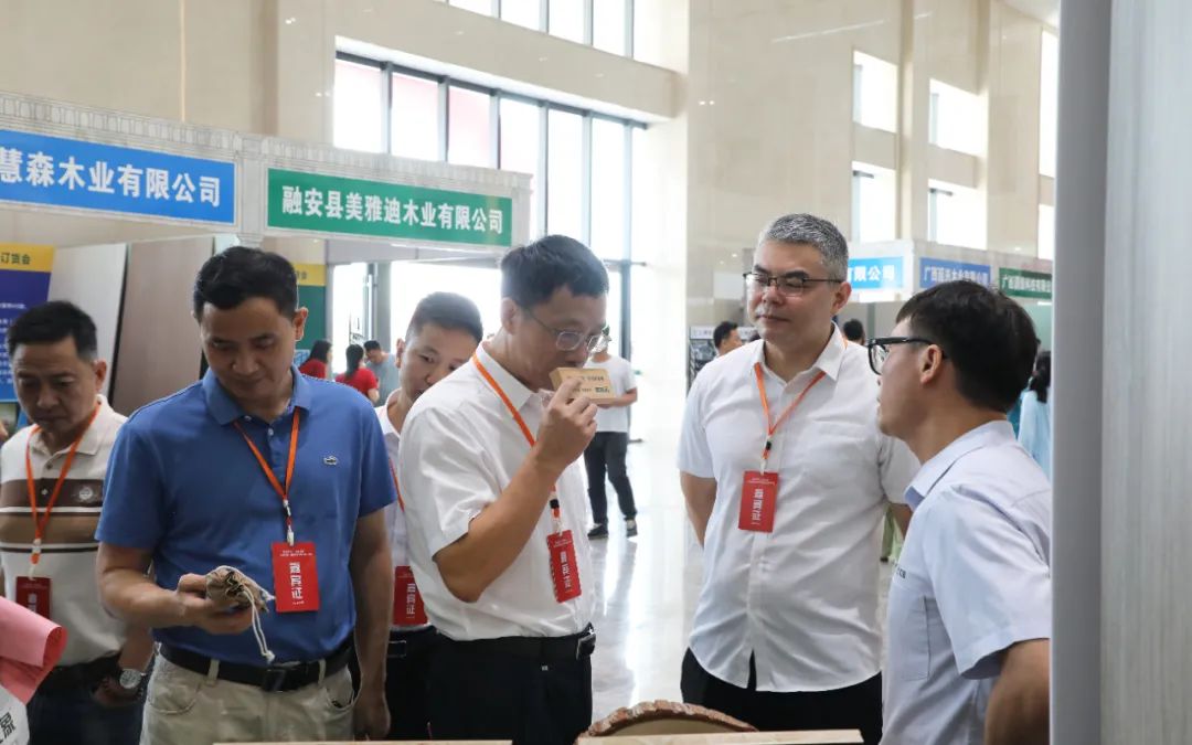 6月29日,在首屆柳州(融安)香杉板材訂貨會現(xiàn)場,柳州市人民政府黨組成員袁東升(中)參觀展廳。(覃嘉鑫 攝)