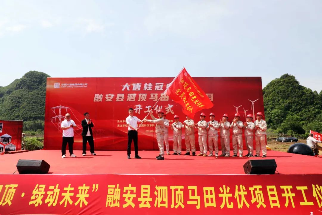 4月28日,在融安縣泗頂馬田光伏項目開工儀式上,為泗頂馬田光伏項目部舉行了“黨員先鋒隊”授旗儀式。(韋榮軍 攝)