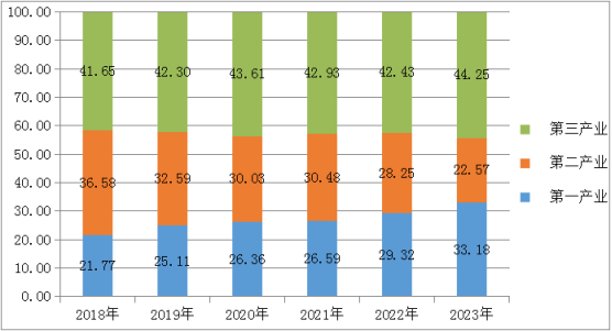 圖二 2018-2023年融安縣三次產(chǎn)業(yè)結(jié)構(gòu)變化圖