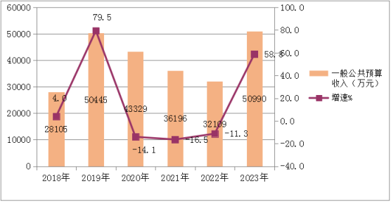 圖三? 2018-2023年融安縣一般公共預(yù)算收入變化柱形圖