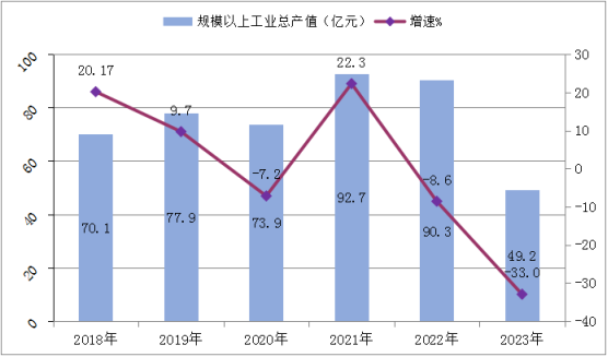 圖六 2018-2023年融安縣規(guī)模以上工業(yè)總產(chǎn)值及增速變化圖
