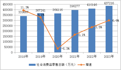 【國(guó)內(nèi)貿(mào)易】全年社會(huì)消費(fèi)品零售總額437216萬(wàn)元,比上年增長(zhǎng)6.6%。按經(jīng)營(yíng)地統(tǒng)計(jì),城鎮(zhèn)消費(fèi)品零售額350472萬(wàn)元,增長(zhǎng)0.6%;鄉(xiāng)村消費(fèi)品零售額86744萬(wàn)元,增長(zhǎng)40.5%。按消費(fèi)類型統(tǒng)計(jì),商品零售額380867萬(wàn)元,增長(zhǎng)7.0%;餐飲收入額56349萬(wàn)元,增長(zhǎng)3.8%。