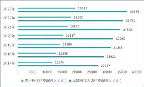 圖九? 2017-2023年融安縣城鄉(xiāng)居民可支配收入變化圖