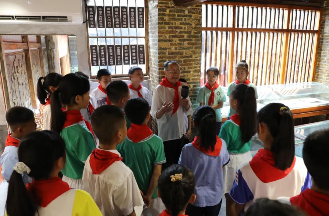 8月2日,在融水縣鯉魚巖抗戰(zhàn)紀(jì)念館,少先隊(duì)員在聆聽老黨員講故事。(楊曼 攝)