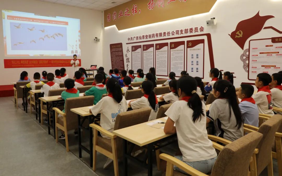 8月2日在廣西仙草堂生態(tài)靈芝透明工廠,少先隊(duì)員們?cè)隈雎犞黝}宣講。(楊曼 攝)