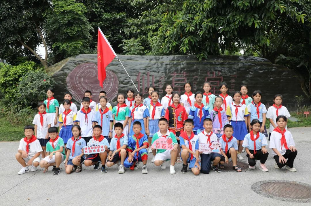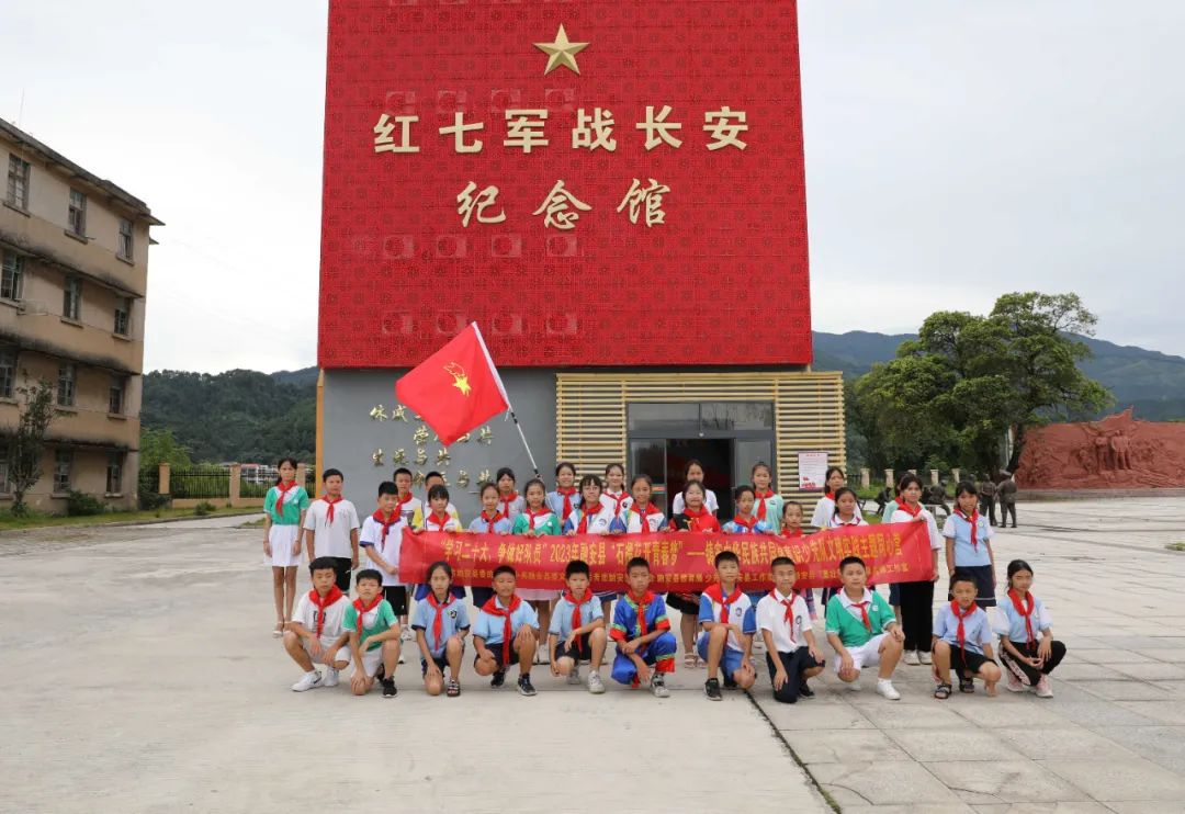 8月2日,少先隊(duì)員在融安縣“紅七軍”戰(zhàn)長安紀(jì)念館前合影留念。(楊曼 攝)