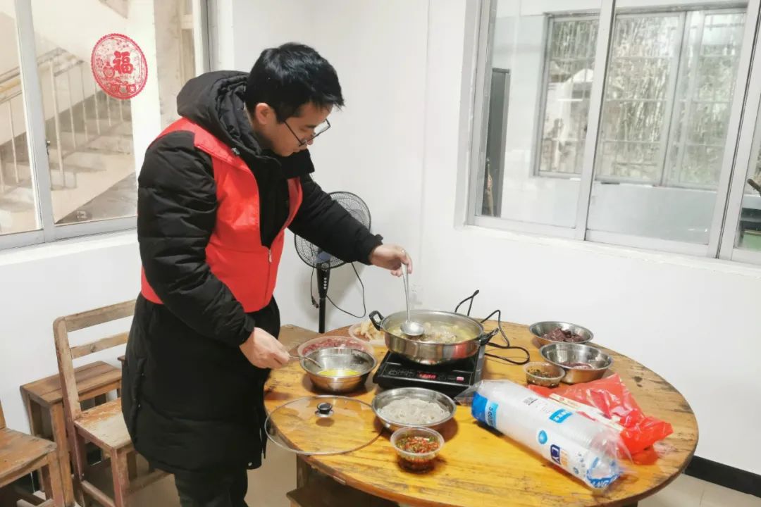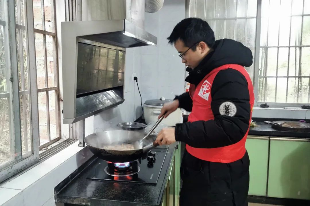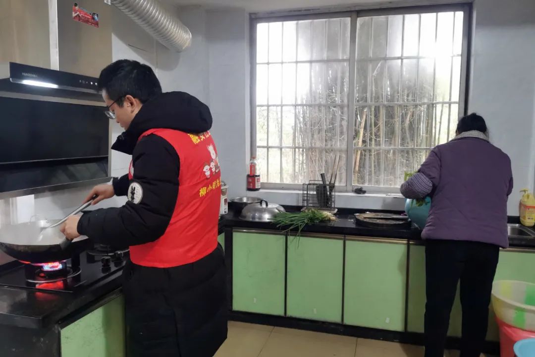 2月7日,在大坡鄉崗偉村敬老院,鄉民政辦志愿者正在給老人們做菜。