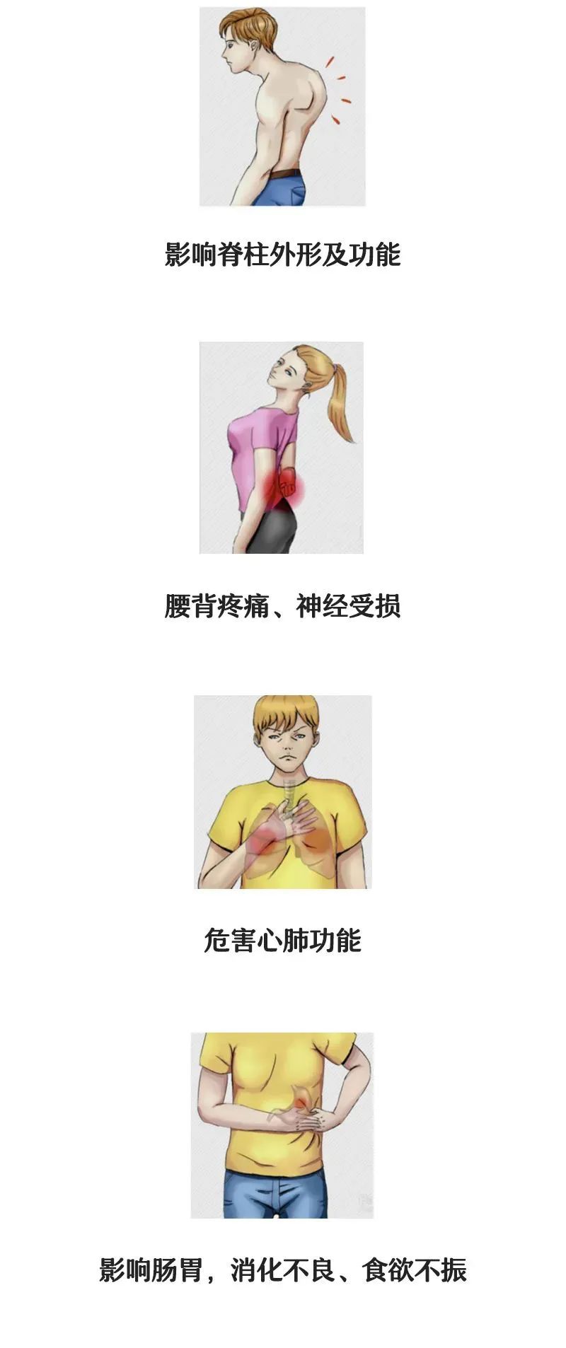 隨著脊柱側彎逐漸加重,外形變化也會顯現出來。外形的異常可能導致心理自卑,影響人際交往,久而久之容易出現心理障礙。?