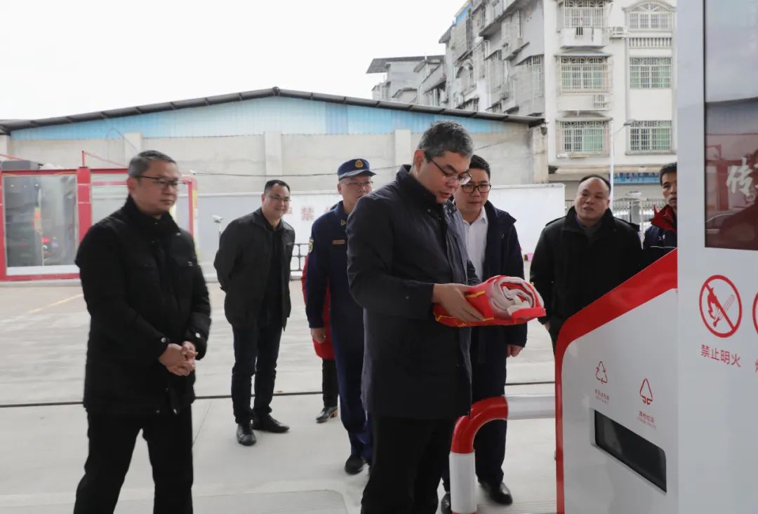 2月7日,在融安縣紅衛加油站,縣委書記、縣長于福堅檢查消防器材。(楊雯靜 攝)