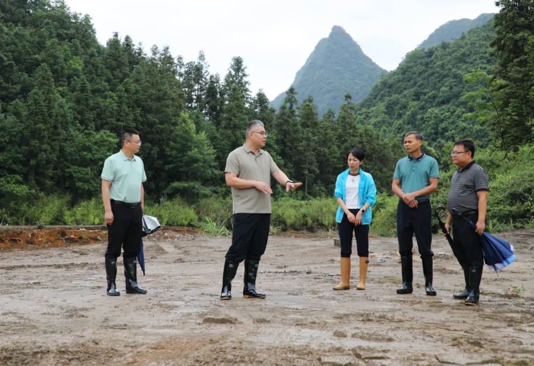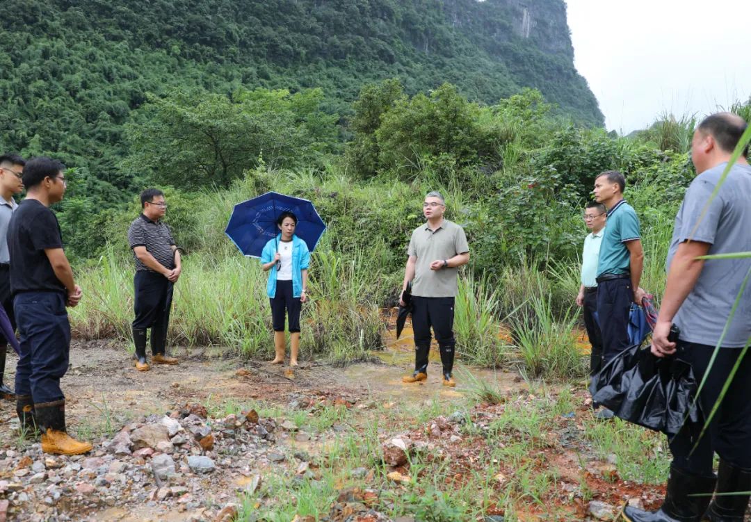 6月20日,在融安縣泗頂鎮(zhèn)無(wú)主廢棄礦山三牛眼礦,縣委書(shū)記于福堅(jiān)(左三)調(diào)研涉重金屬環(huán)境安全隱患排查整治工作。(楊曼 攝)