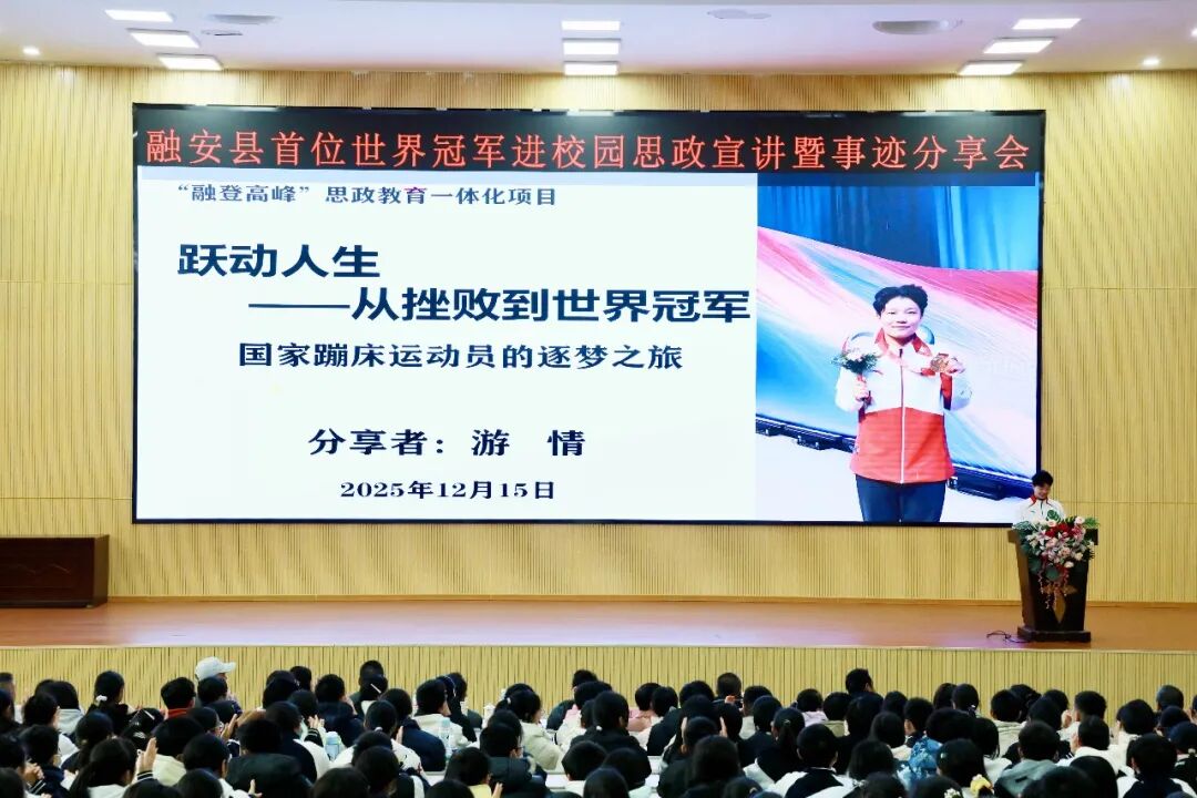 “請相信堅持的力量。無論你的賽場在何處,無論你的夢想是什么,請堅守它,并為之付出不懈的努力。”12月15日,剛剛載譽歸鄉的第38屆世界蹦床錦標賽混合全能團體冠軍游情走進融安縣第二中學,以“躍動人生:從挫敗到世界冠軍”為主題,為全縣近千名中小學生帶來了一堂別開生面的思政課,用自己的追夢奪冠經歷點燃青少年的理想之火。