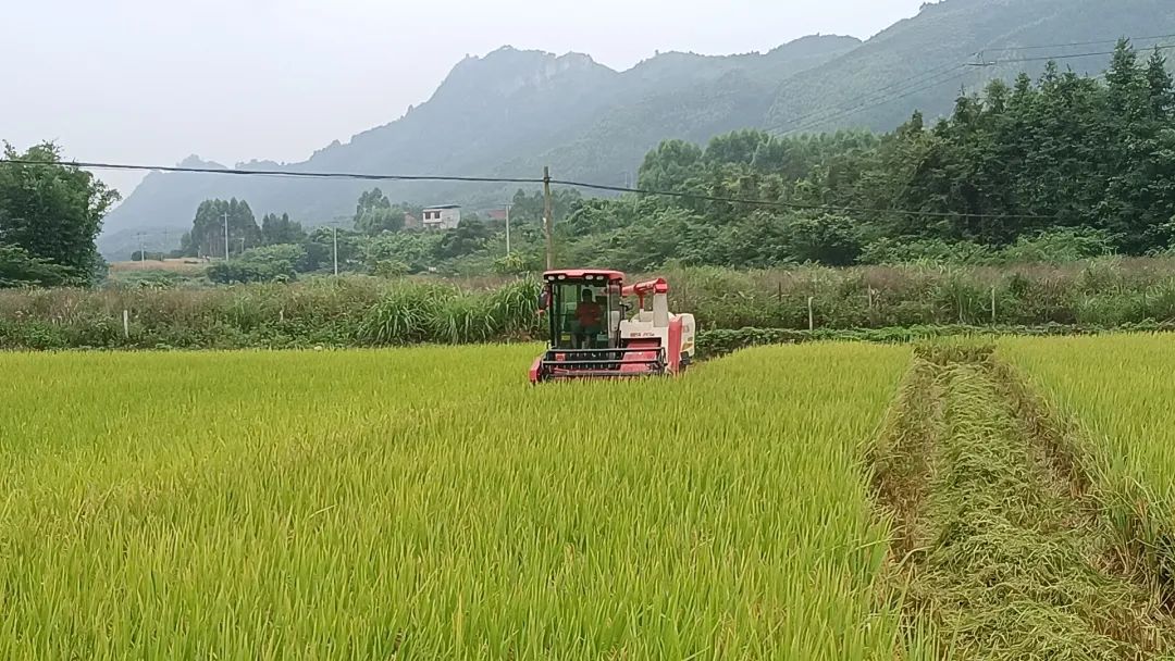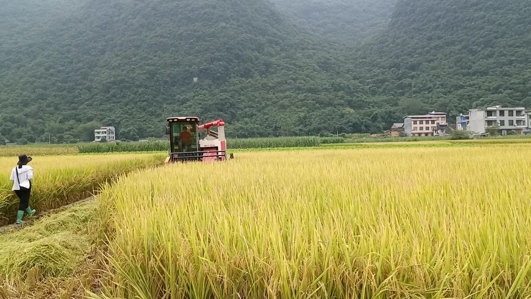 在浮石鎮諫村村的稻田里,收割機正在收割水稻。