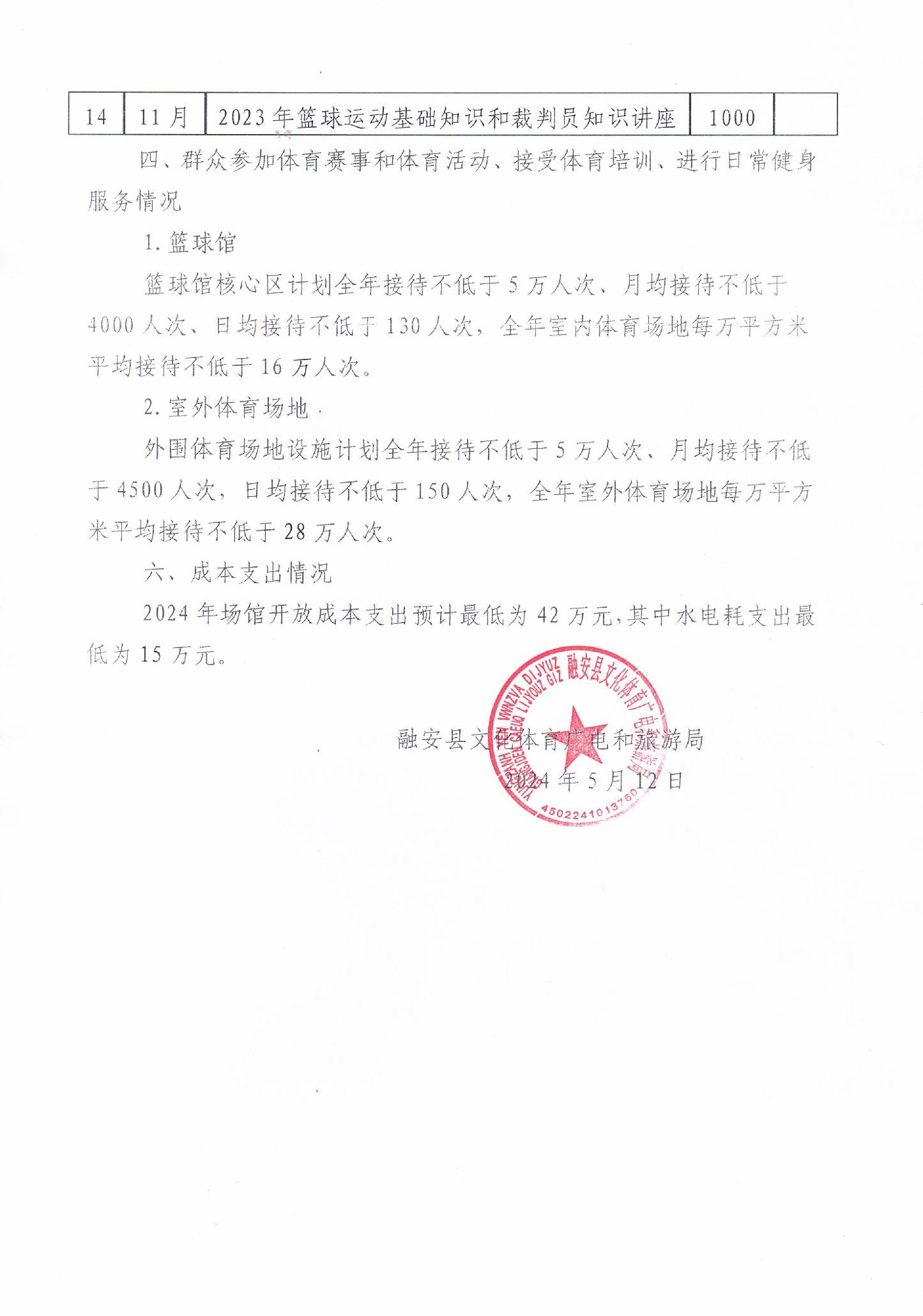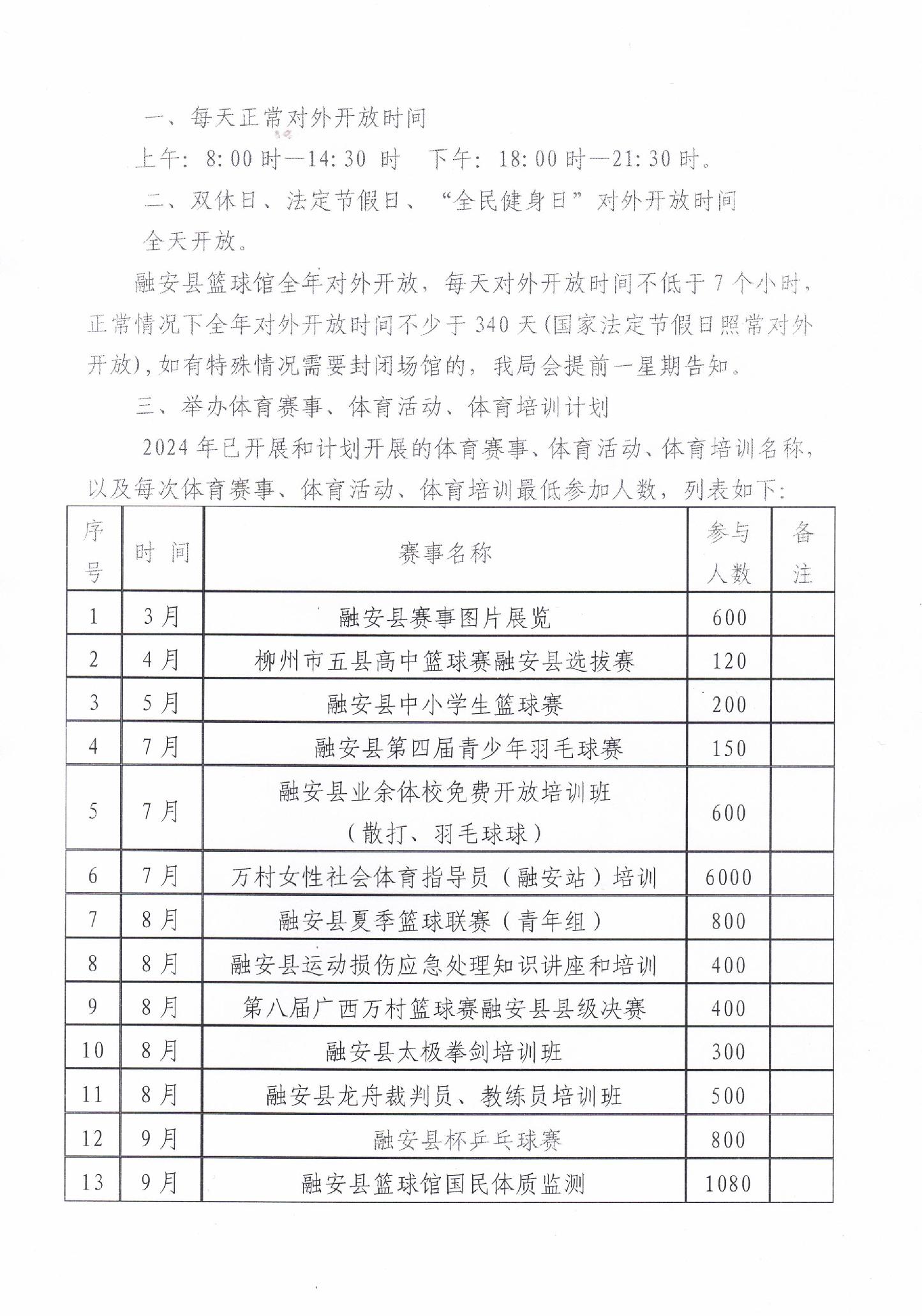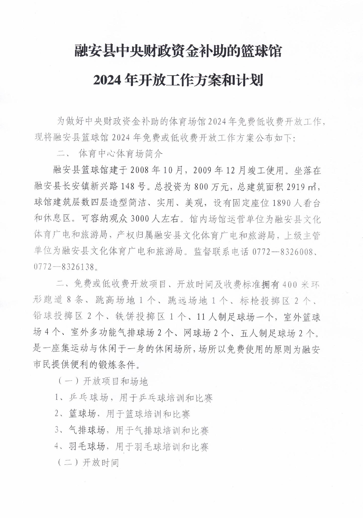 融安縣中央財政資金補助的籃球館2024年開放工作方案和計劃
