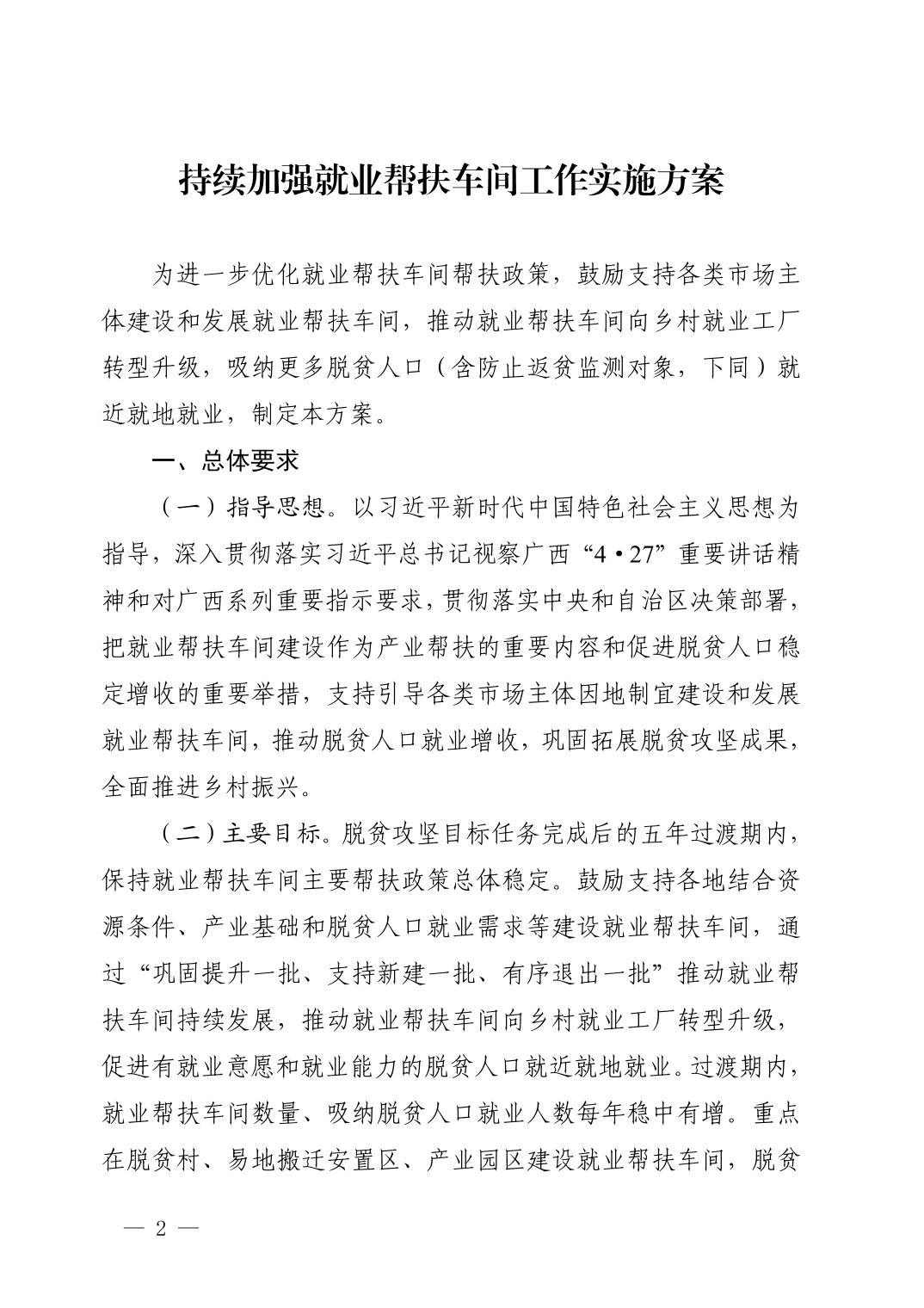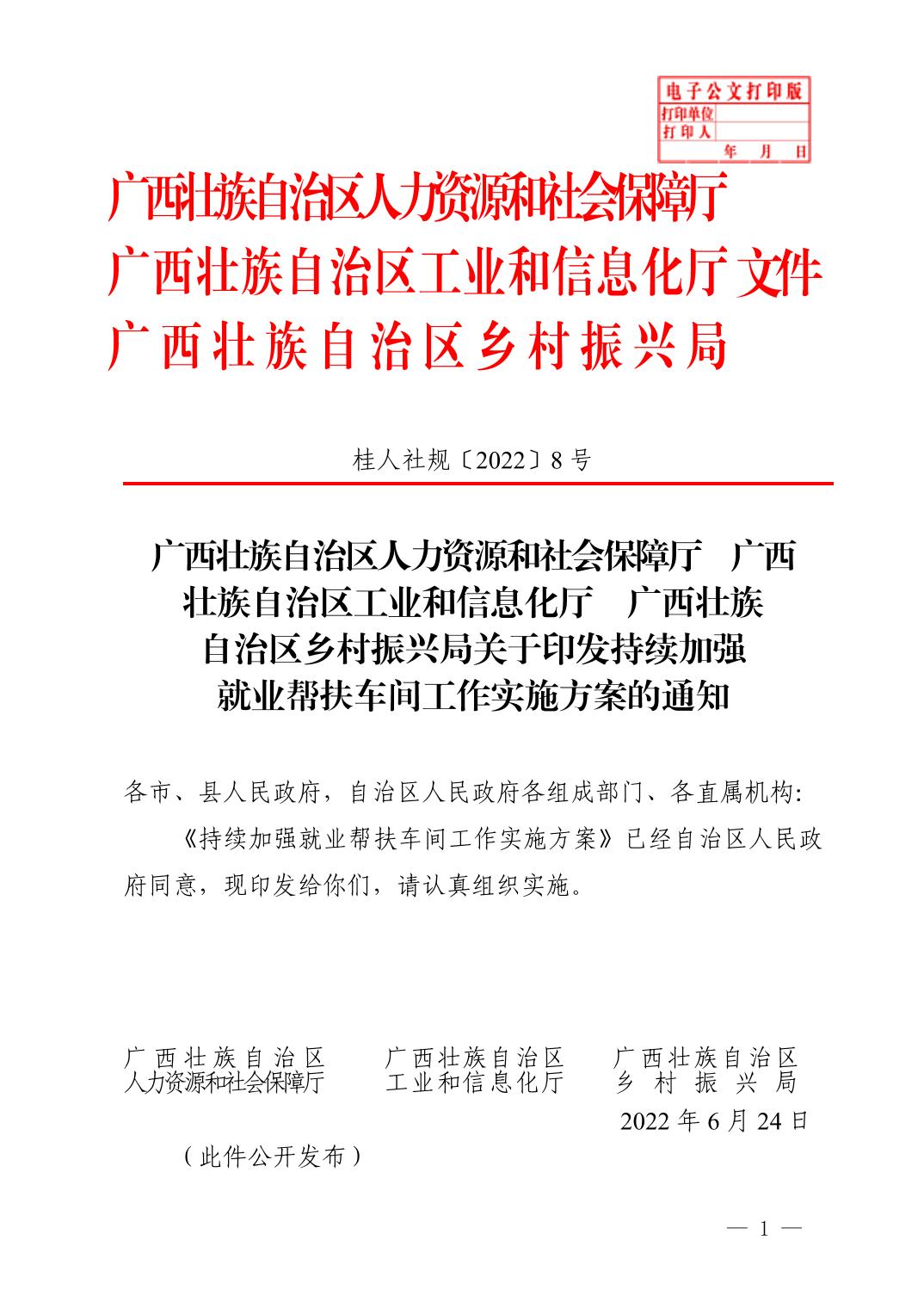 廣西壯族自治區(qū)人力資源和社會保障廳 廣西壯族自治區(qū)工業(yè)和信息化廳 廣西壯族自治區(qū)鄉(xiāng)村振興局關(guān)于印發(fā)持續(xù)加強就業(yè)幫扶車間工作實施方案的通知