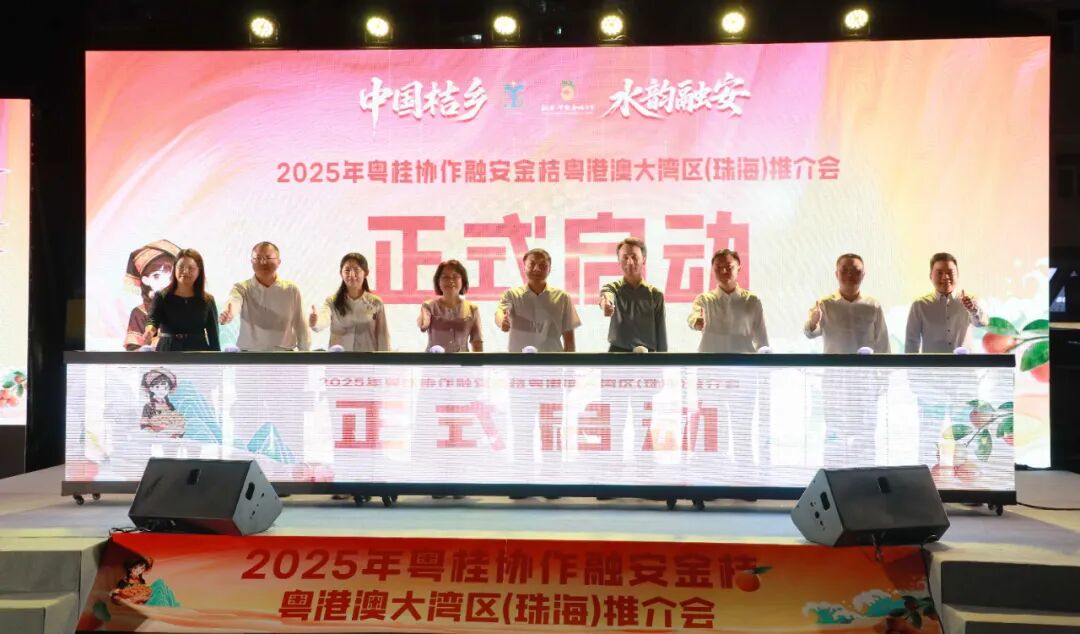桂品入粵結碩果、協力同心譜新篇。11月8日,2025年粵桂協作融安金桔粵港澳大灣區(珠海)新聞發布會暨推介會在廣東省珠海市成功舉辦。帶著桂北山區的生態靈氣與壯鄉人民的淳樸情誼,首批優質融安金桔跨越山海抵達大灣區,為市民送上冬日里的清甜饋贈,更以一場高規格的產業推介,奏響了粵桂協作產業共興、區域共贏的嶄新樂章。當晚,“水果珍品 融安金桔”大型公益廣告亮相珠海地標建筑日月貝,繼廣州塔、深圳京基100大廈之后,再次讓融安金桔在大灣區核心地標綻放光彩,彰顯品牌實力與推廣決心。