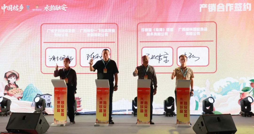 11月8日晚間,推介會在珠海市揚名廣場圓滿舉行。活動現場,粵港澳大灣區18家知名水果采購企業與融安縣10家金桔龍頭企業精準對接、達成共識,現場簽訂融安金桔購銷合同,簽約金額高達3.6億元,為融安金桔深耕大灣區市場奠定堅實基礎,也為粵桂消費協作寫下濃墨重彩的一筆。