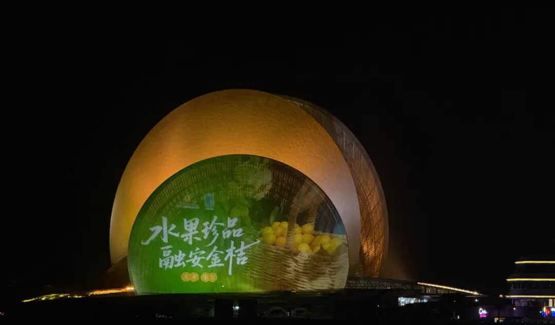 11月8日晚,“水果珍品 融安金桔”大型公益廣告亮相珠海地標建筑日月貝。(方淑敏 攝)