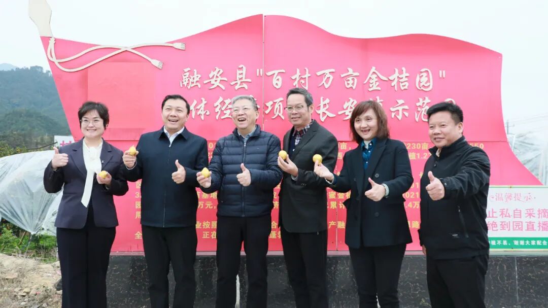 12月4日,參會代表深入融安縣桔鄉戀歌金桔產業核心示范區實地觀摩,領導嘉賓合影留念。(方淑敏 攝)