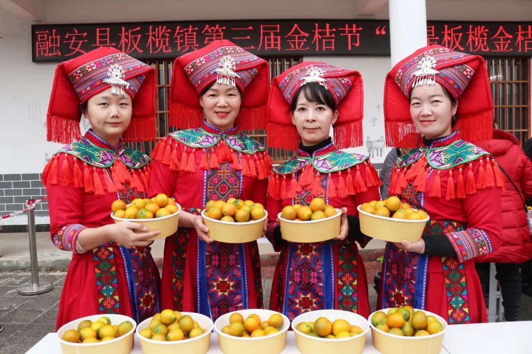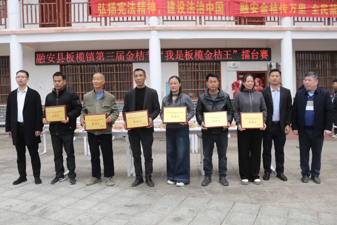 12月2日,在融安縣板欖鎮第三屆金桔節“我是板欖金桔王”擂臺賽活動現場,領導嘉賓與滑皮金桔獲獎選手合影留念。(黃寶玲 攝)