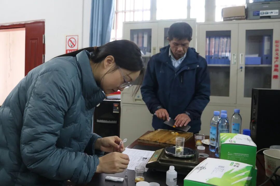 12月2日,在融安縣板欖鎮第三屆金桔節“我是板欖金桔王”擂臺賽活動現場,工作人員正在做金桔糖度測試。(黃寶玲 攝)