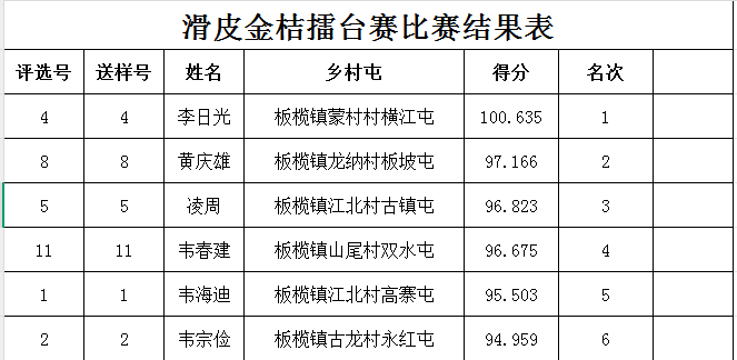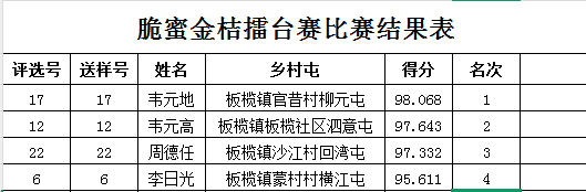 此次比賽,經過評審小組認真測評,評委們通過果實外觀、大小、果實內部種子數、固形物含量及口感等進行評分,最后經工作人員統計各項分數,按照綜合分數的高低選出前六名的滑皮金桔單位和前四名脆蜜金桔單位作為我鎮的最佳金桔代表參加融安縣第十六屆金桔文化旅游節“我是融安金桔王”擂臺賽決賽。