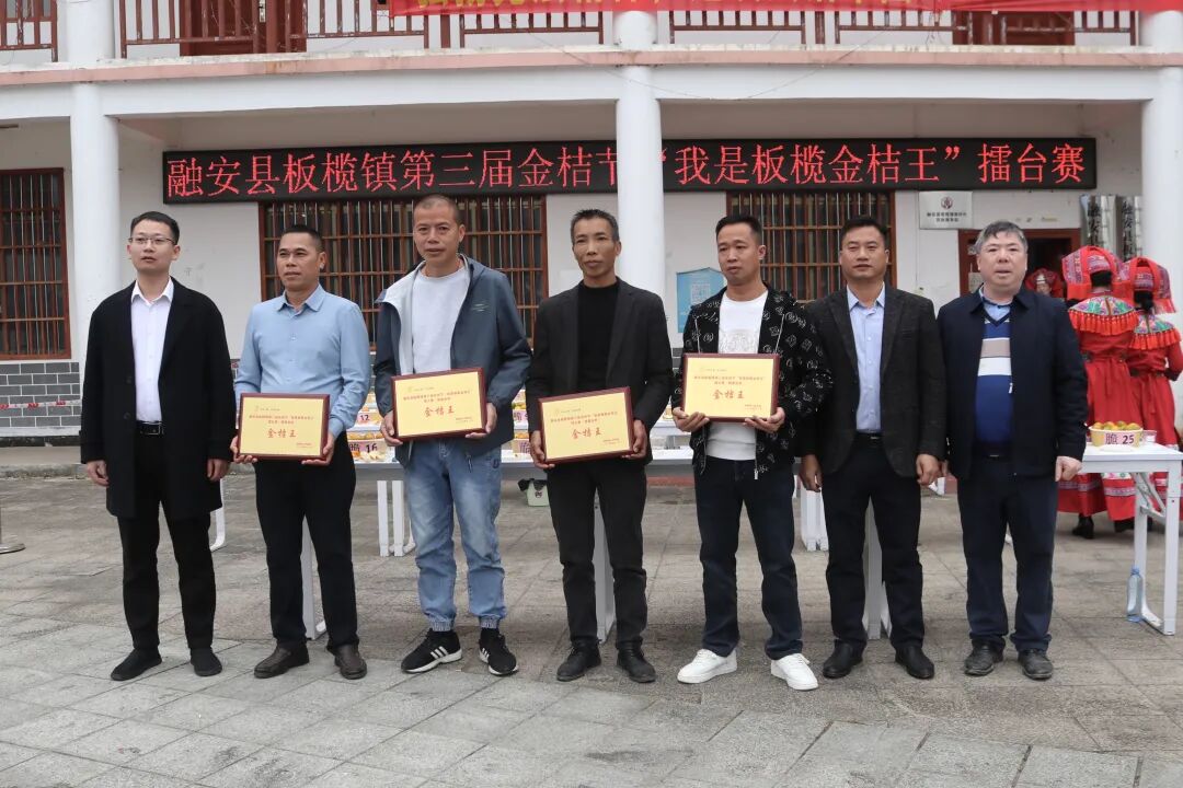 12月2日,在融安縣板欖鎮第三屆金桔節“我是板欖金桔王”擂臺賽活動現場,領導嘉賓與脆蜜金桔獲獎選手合影留念。(黃寶玲 攝)