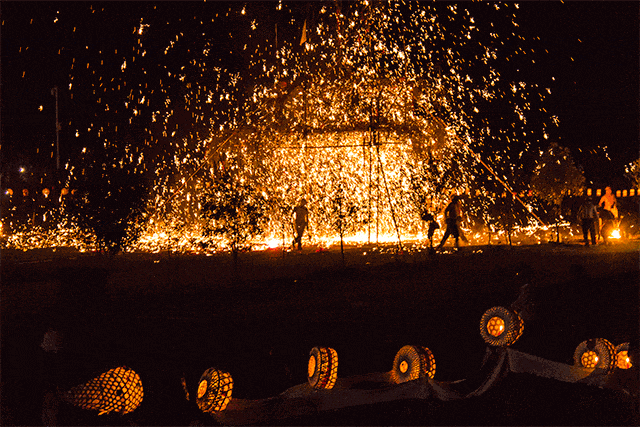 燦爛如花綻夜空,流星似雨灑巒崇。有一種景觀,它燦若煙花,美麗卻讓人望而卻步——因為要將1600多攝氏度的鐵水打向高空,才能產生這樣的美,鐵花在空中迸散開來,猶如滿樹盛開的梨花。整個打鐵花進程是由四五個人協作,一人用勺舀起鐵水,甩到空中,另一人頭戴草帽,用特制的木板將鐵水敲打開來,鐵水在夜空中散落,一片燦爛的星花在夜色中綻放開來,表演者冒著被燙傷的風險,只為夜間那漫天華彩、遍地生金的景象。