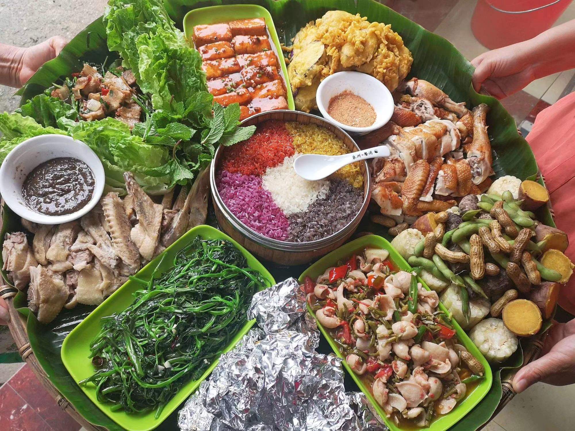 簸箕宴是壯族最具代表的宴席,招待貴賓的首選。簸箕是一種農(nóng)具,由竹編而成,也是家家戶戶必不可少的生活用品,在簸箕底部墊著新鮮翠綠的芭蕉葉,鋪裝滿滿的壯家美食,葷、素、主食、雜糧等一應(yīng)俱全。逢年過(guò)節(jié)用簸箕宴來(lái)招待親朋好友,一群人圍坐于宴前,聊家常,談人生、述理想,懷念過(guò)往,展望未來(lái),回歸自然的質(zhì)樸享受,在歡聲笑語(yǔ)中體現(xiàn)壯鄉(xiāng)人熱情與好客!